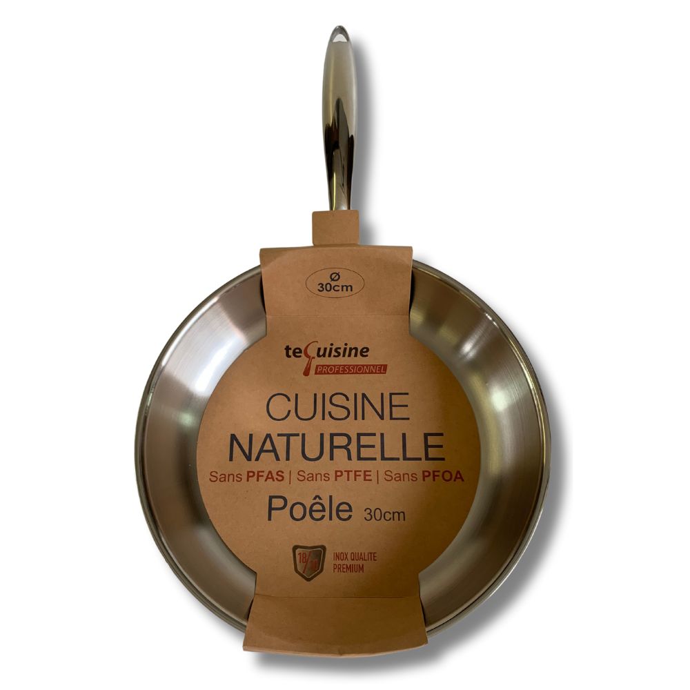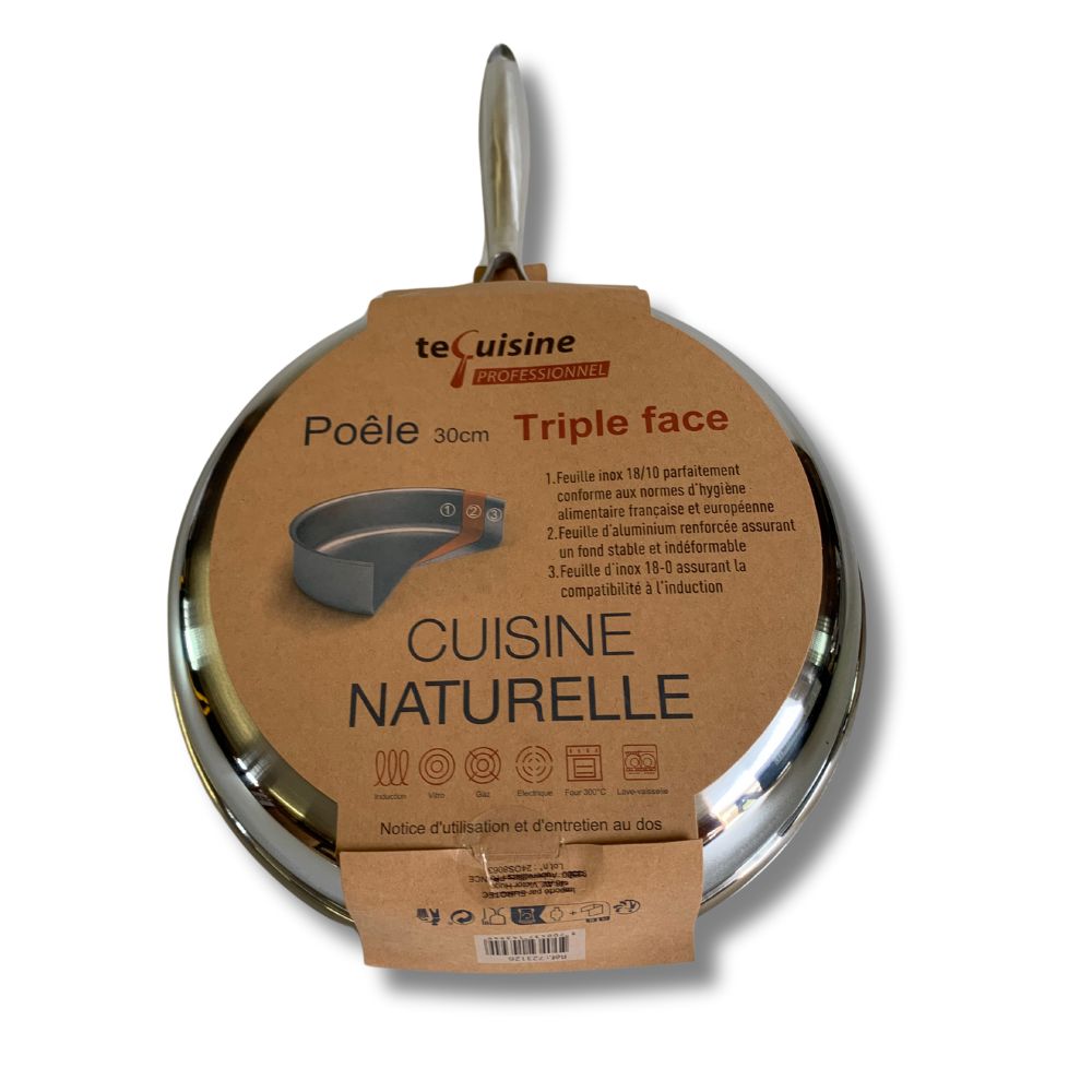 Poêle Te Cuisine Professionnel Triple Face en inox, sans PFAS, PTFE, PFOA, disponible en 20cm, 28cm et 30cm, pour une cuisson saine et performante.