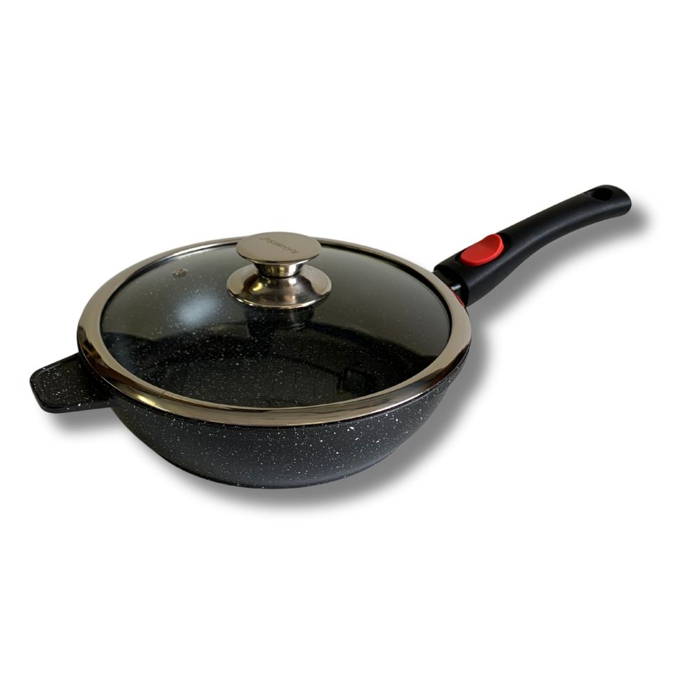 Sauteuse Kamberg disponible en 24 ou 28 cm, avec revêtement antiadhésif type pierre et poignée amovible. Compatible tous feux, y compris induction, et certifiée sans PFOA, sans plomb, sans cadmium.